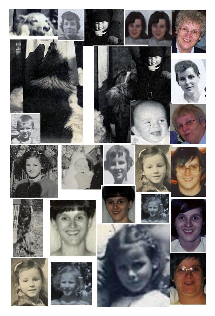 A collage of photo's of Diane at many ages including Laddie her dog and her nephew baby Nickie